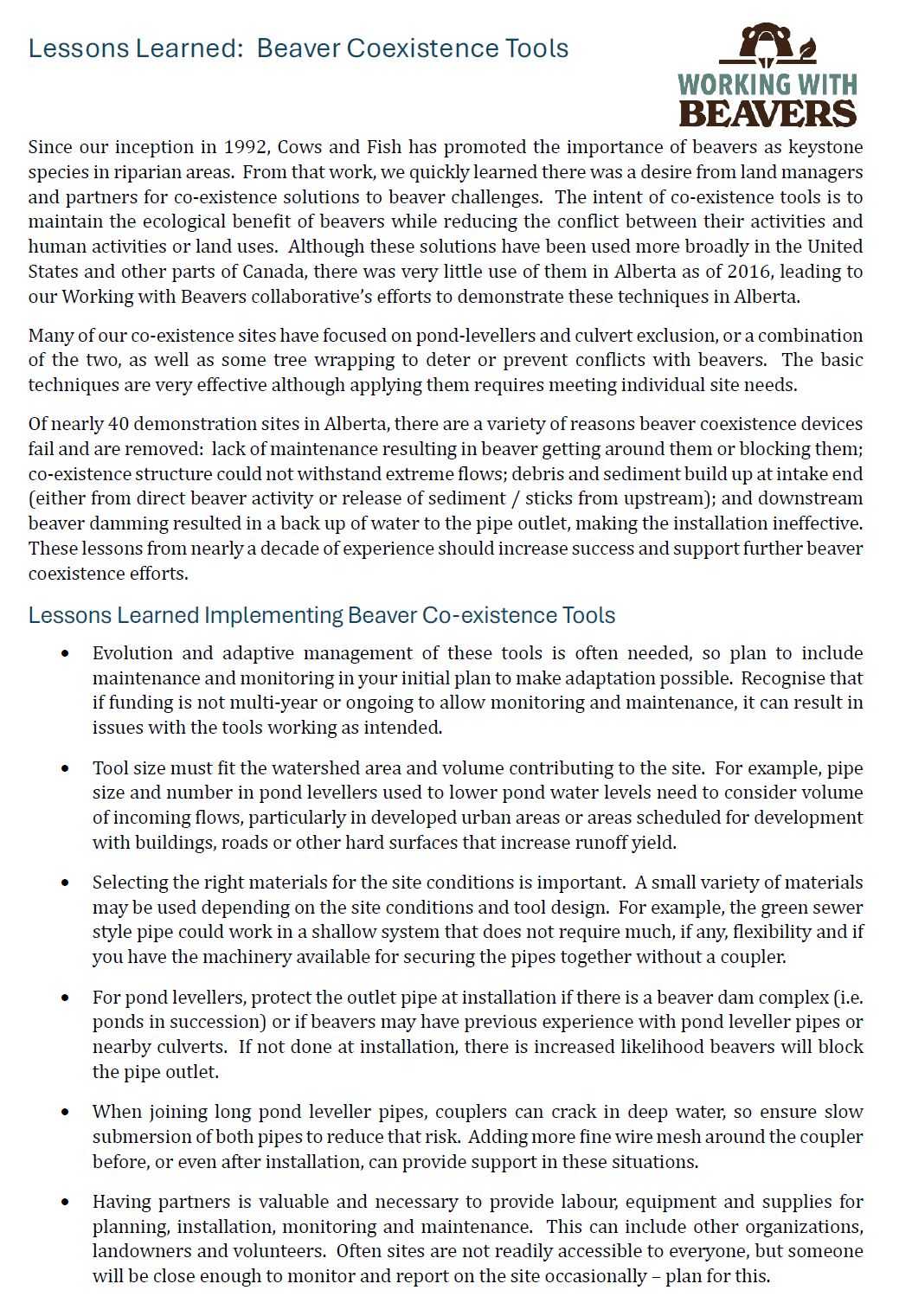 The purpose of the Alberta Beaver BMPs is to provide information about available beaver management tools with the goal of improving implementation of beaver coexistence tools in Alberta. By improving human-beaver coexistence, challenges can be mitigated while still maintaining beavers on the landscape, supporting watershed and ecological health and the ecosystem services provided.