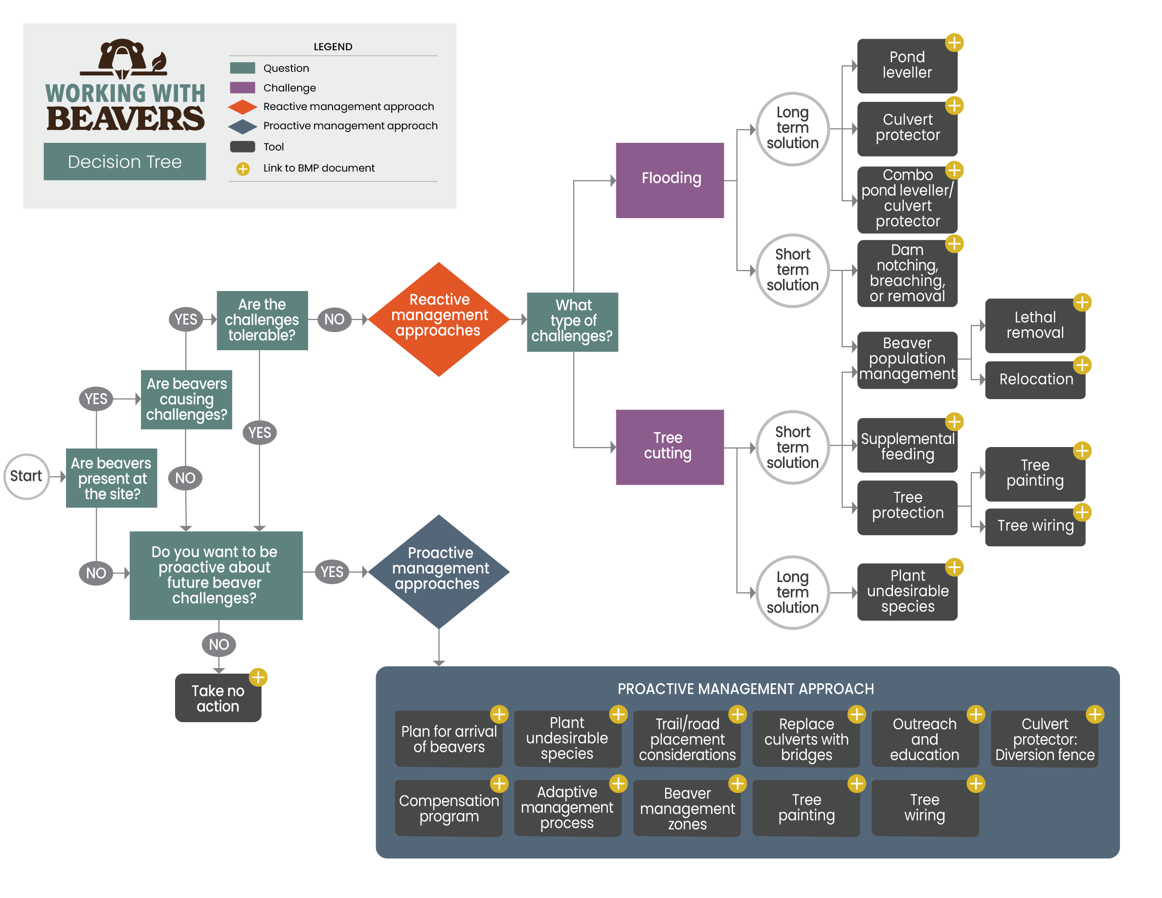 An interactive decision tree was created to accompany the BMPs to aid the decision-making process for how best to address the beaver issue at hand. The tree prompts yes/no answers to a series of questions that guides the user to consider both reactive and proactive management approaches that include coexistence tool options. Clicking on the coexistence tool of choice will take you to the corresponding section of the BMP document.